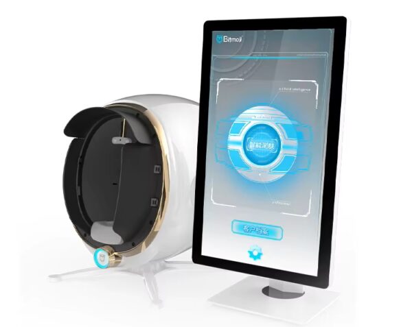 Este analizador facial combina la más avanzada tecnología de inteligencia artificial con un sistema de cámaras de alta resolución para ofrecer un diagnóstico preciso y detallado del estado de la piel. Su diseño moderno con cápsula de análisis y pantalla táctil permite una experiencia profesional, interactiva y confiable tanto para el especialista como para el cliente.