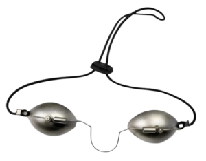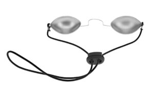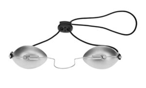 Gafas de protección ocular fabricadas en acero inoxidable de alta resistencia, diseñadas especialmente para procedimientos con equipos láser en el área estética y médica. Su diseño ergonómico con copas metálicas ajustables proporciona una cobertura segura y precisa de los ojos, garantizando máxima protección durante tratamientos con alta intensidad lumínica.