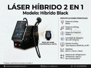 El Láser Híbrido Black (Láser Diodo Trionda + Láser Nd:YAG) es un equipo de tecnológica avanzada diseñada para ofrecer soluciones integrales en medicina estética y dermatología. Este equipo multifuncional 2 en 1 integra dos tecnologías láser independientes en una sola plataforma, permitiendo ampliar el portafolio de tratamientos con alta eficacia, seguridad y versatilidad clínica.