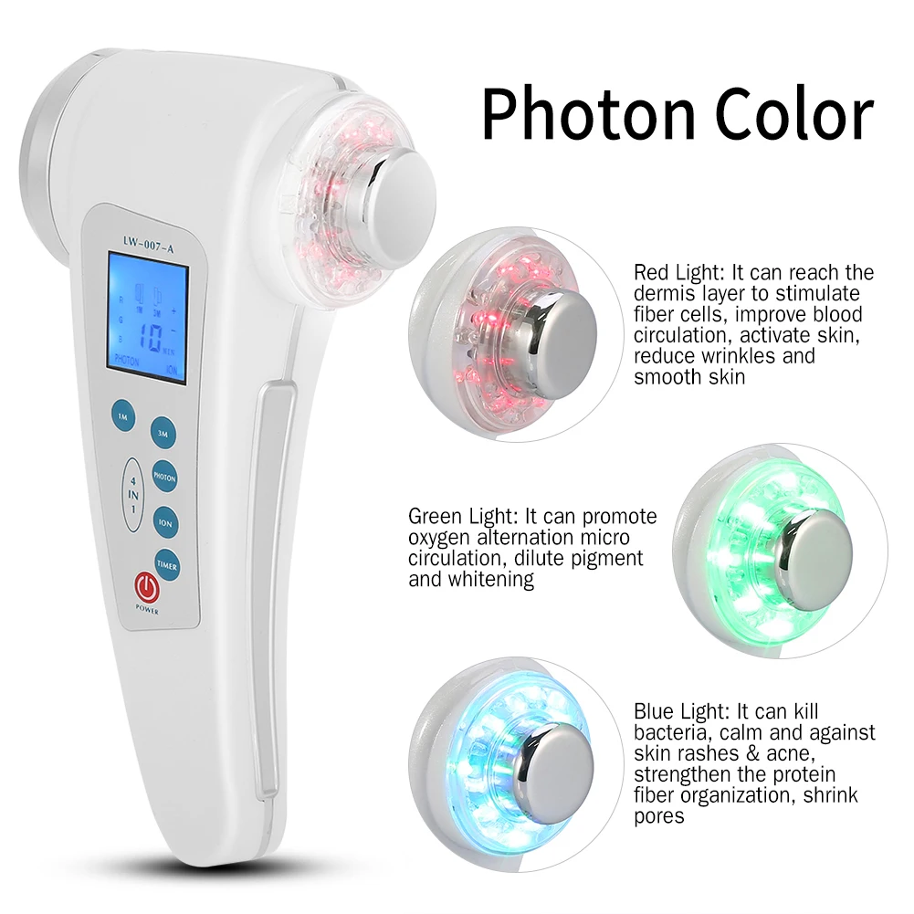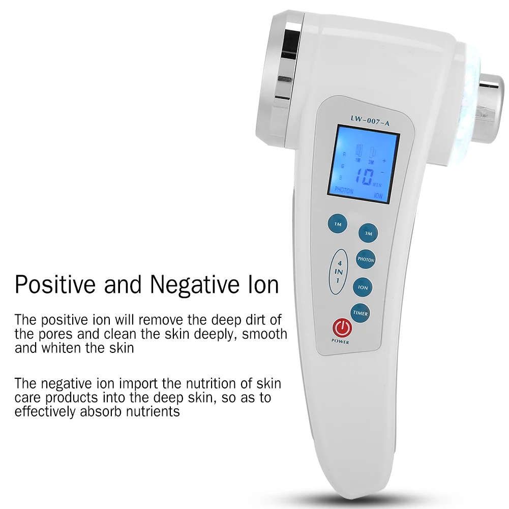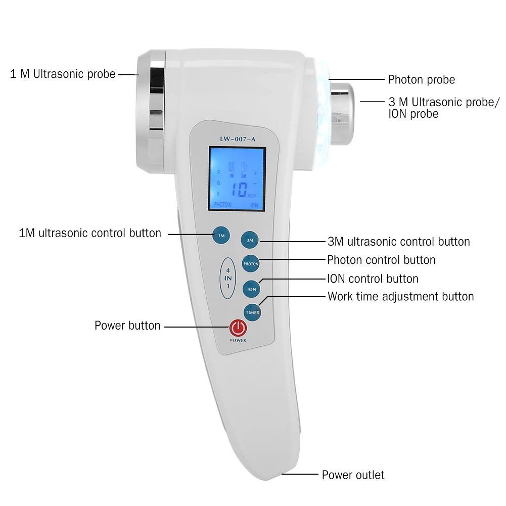 - Máquina de belleza 4 en 1 con funciones de ultrasonidos (1 M, 3 M), fotones, importación/exportación de iones.